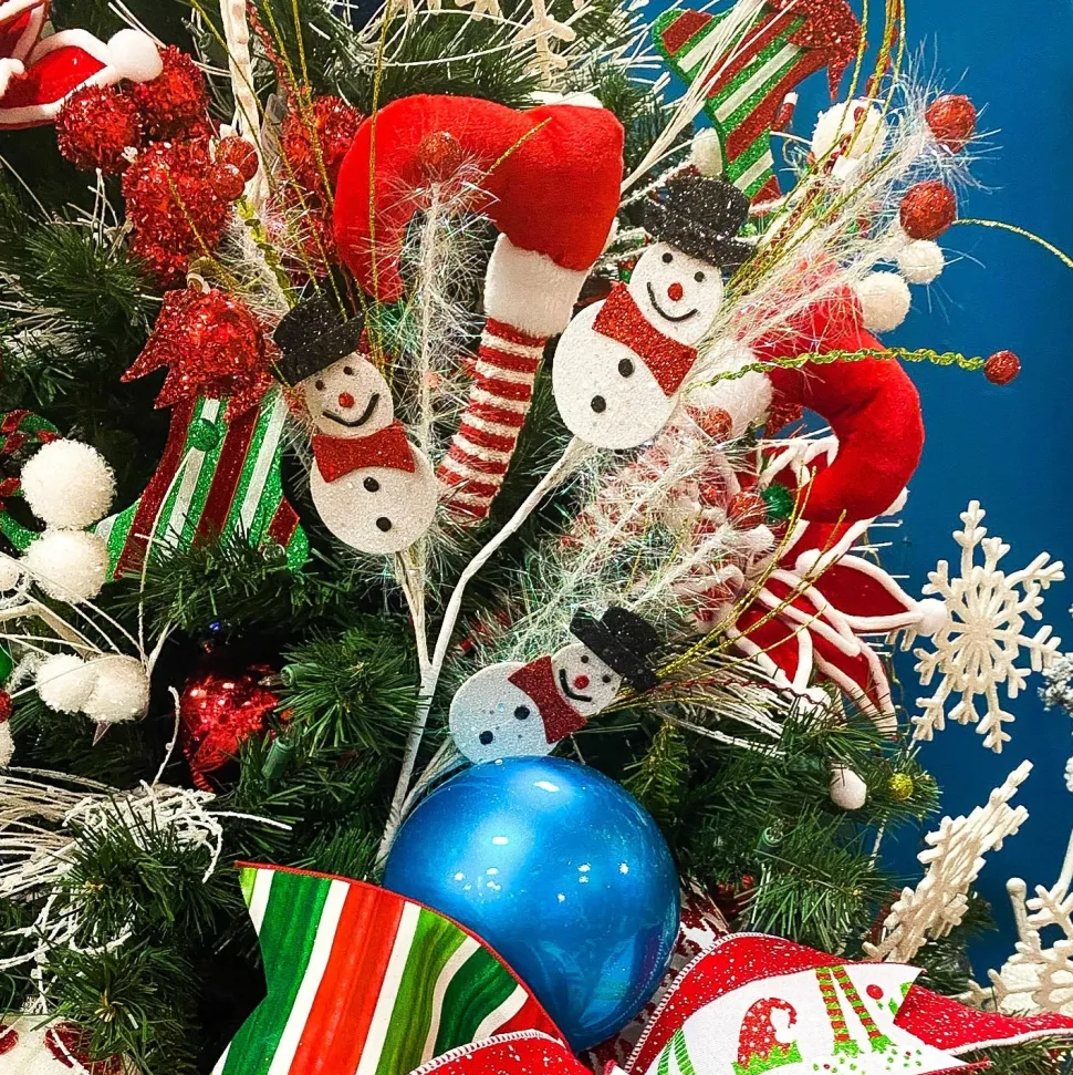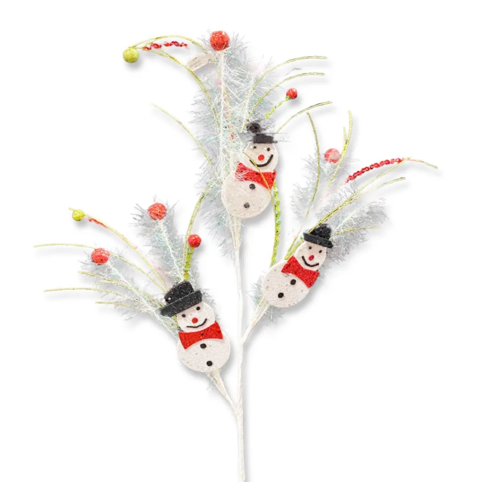 This trio of snowmen have a sparkle in their eye and a glittery snowy finish to match. They’re dancing through irridescent fringe, red and lime green onion grass and sequined stems to create a Christmas winter wonderland.